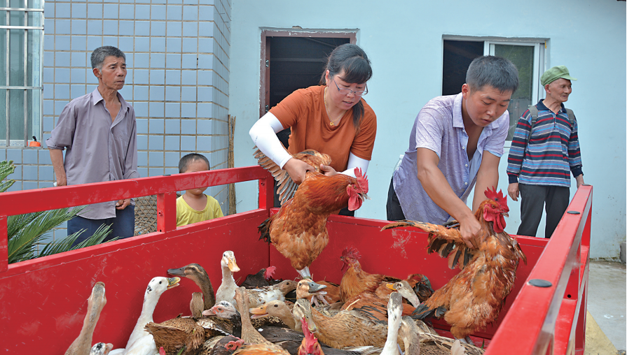 6月13日,大观镇庙坝村,村干部与农户将高校教师购买的土鸡、土鸭装车送往集中宰杀点。