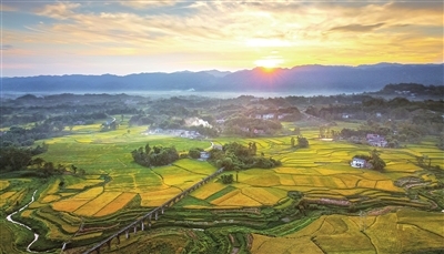 明达镇红八村,金色稻田,丰收如画