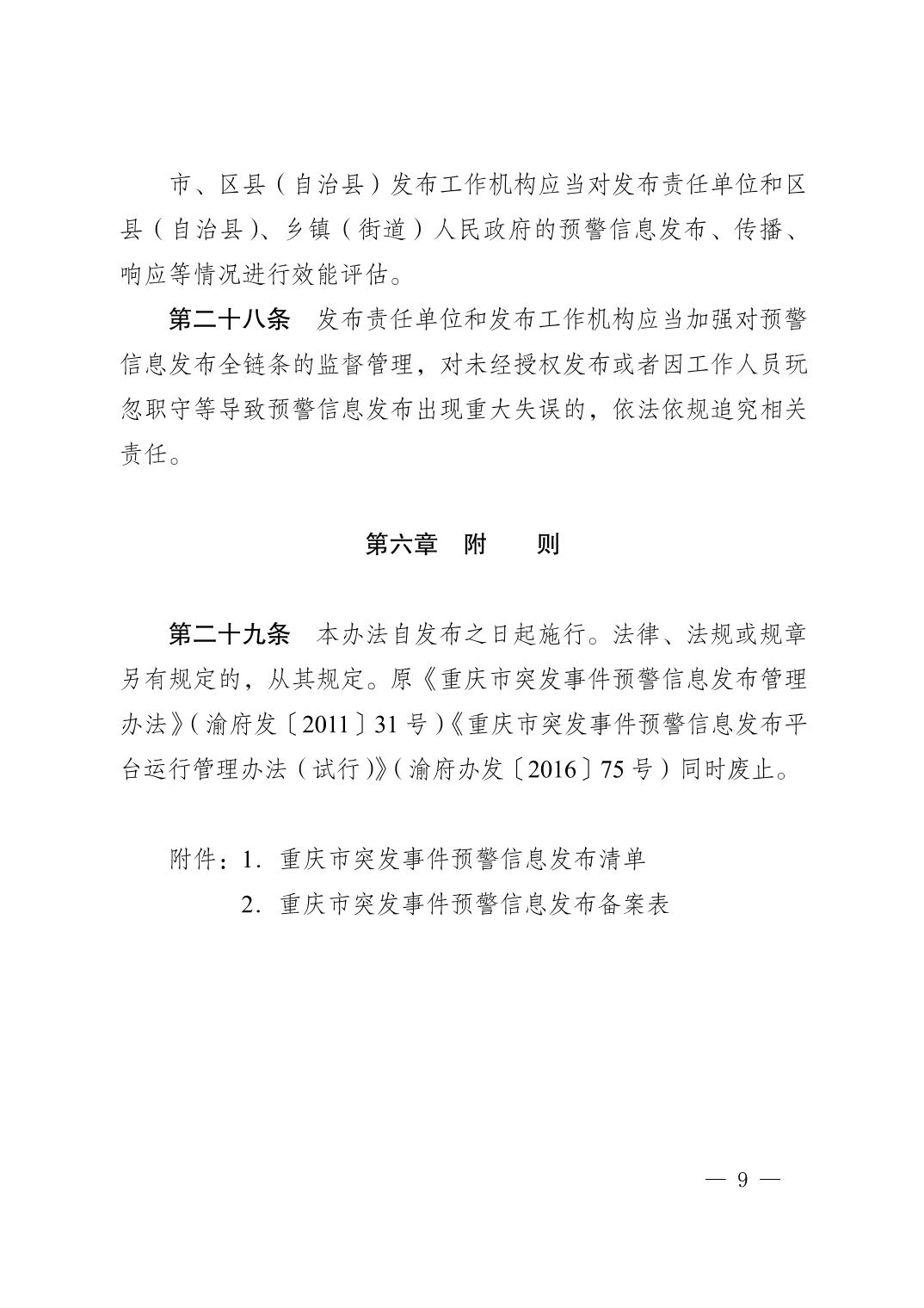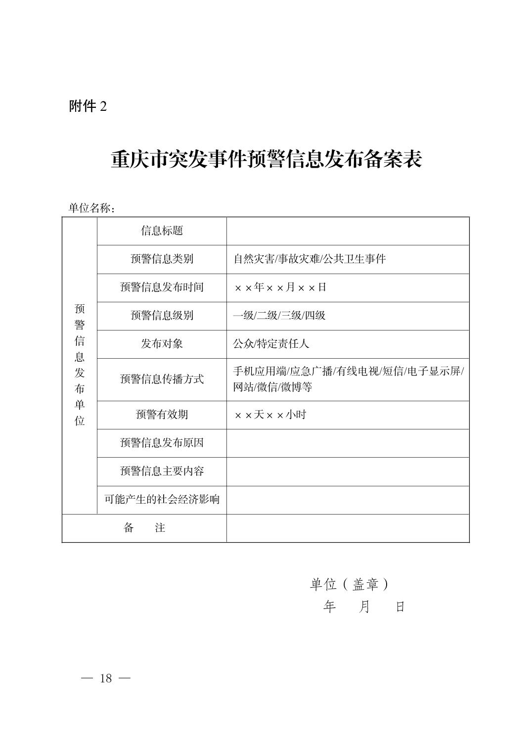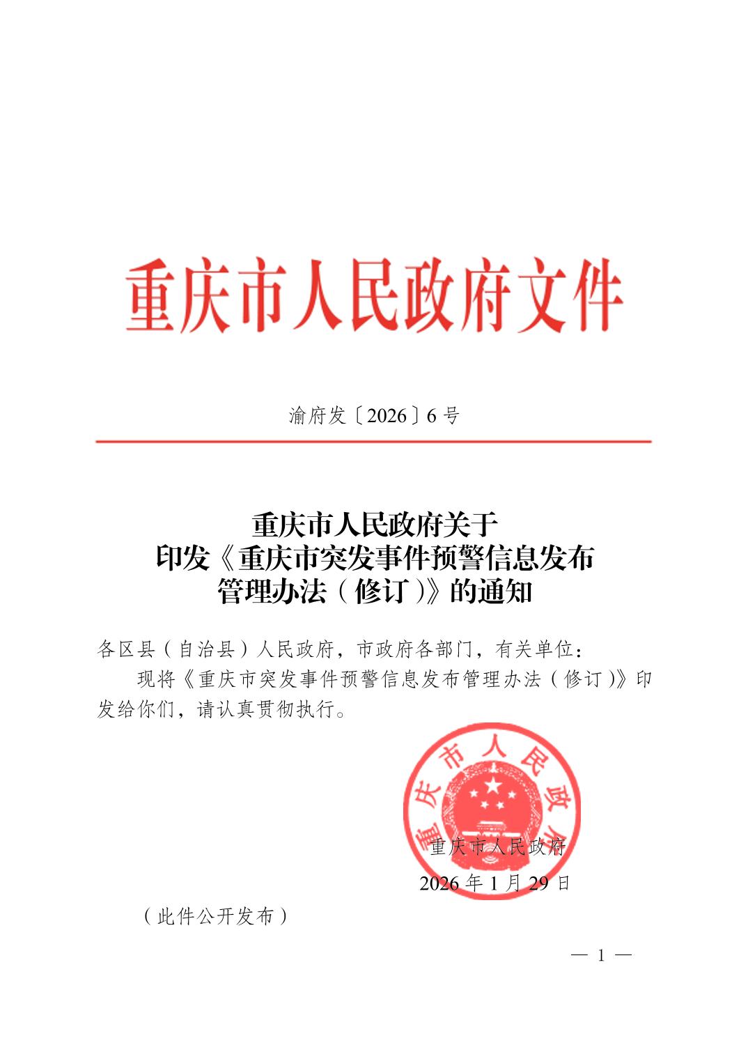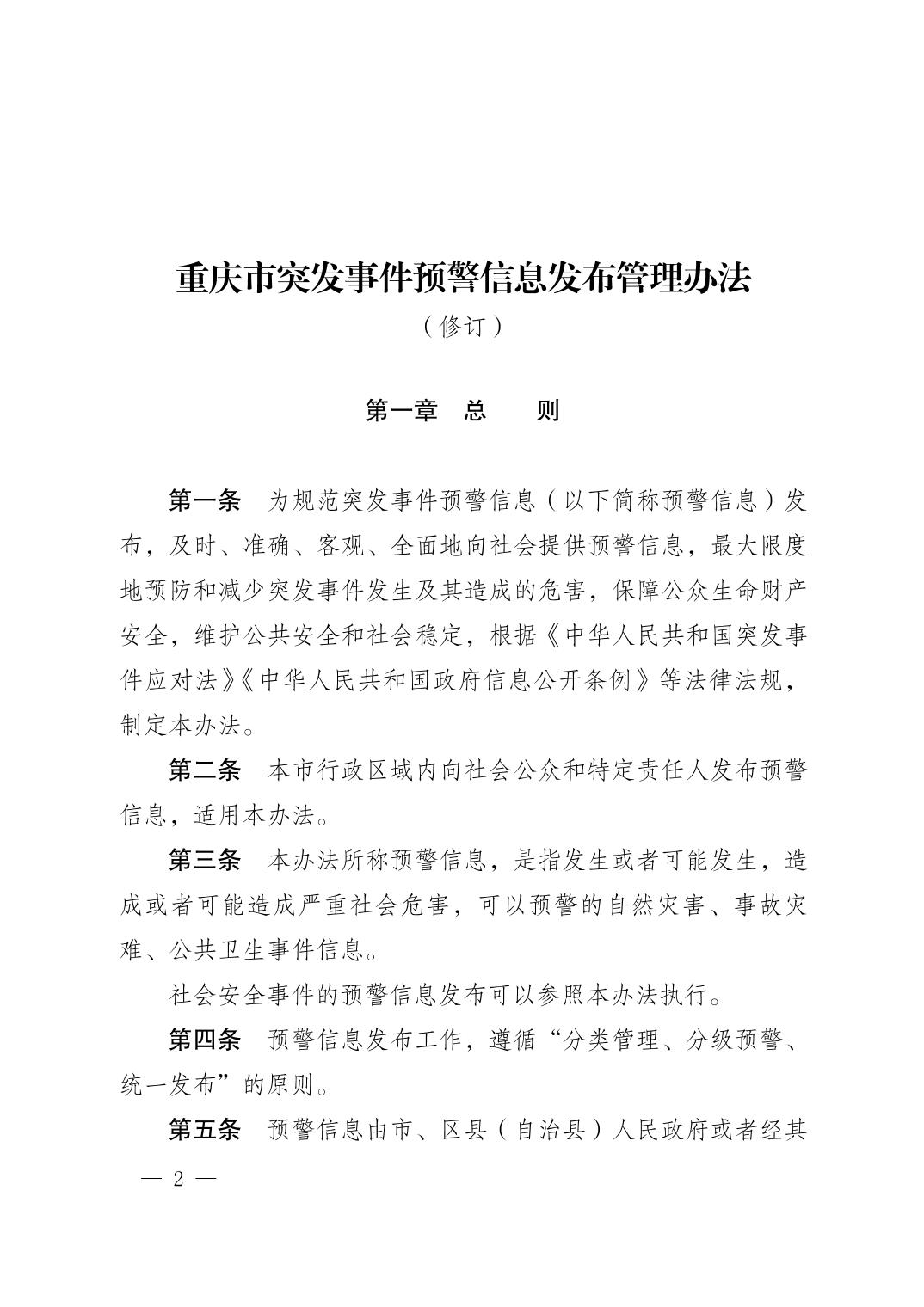 | 标题 | 重庆市人民政府关于 印发《重庆市突发事件预警信息发布管理办法(修订)》的通知 |