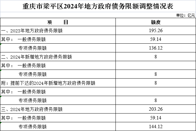 | 标题 | 重庆市梁平区2024年地方政府债务限额调整情况表 |