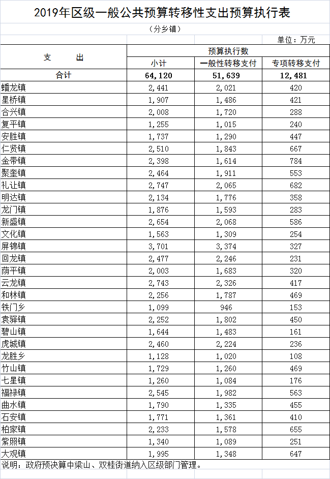 | 标题 | 2019年区级一般公共预算转移性支出预算执行表 (分乡镇) |