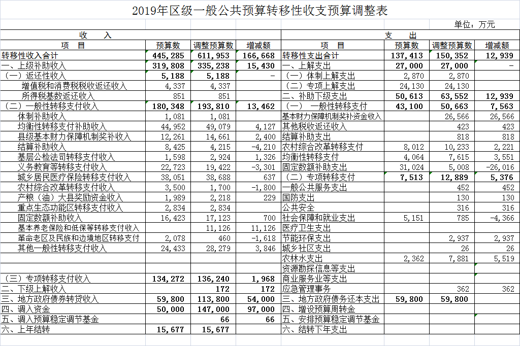 | 标题 | 2019年区级一般公共预算转移性收支预算调整表 |