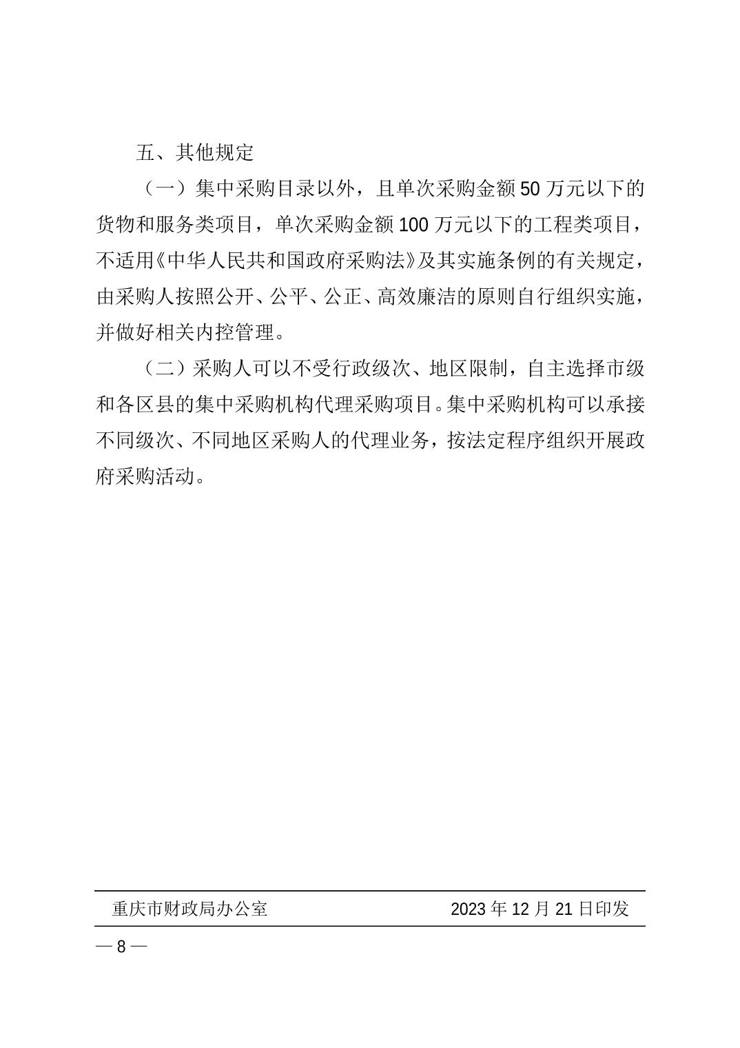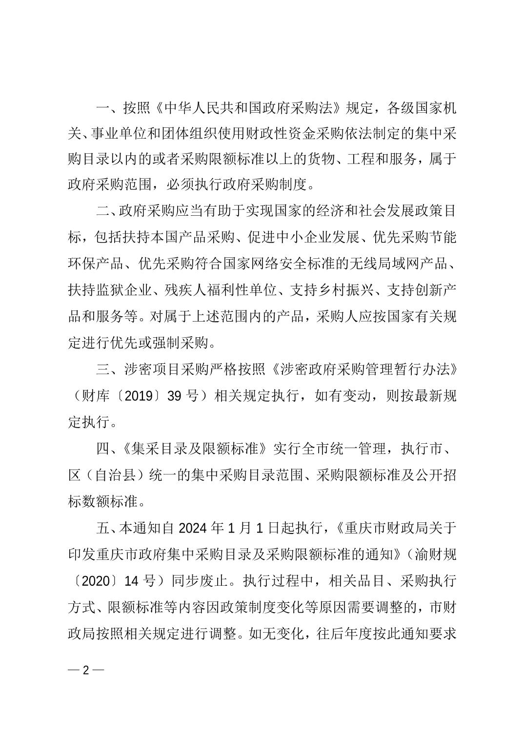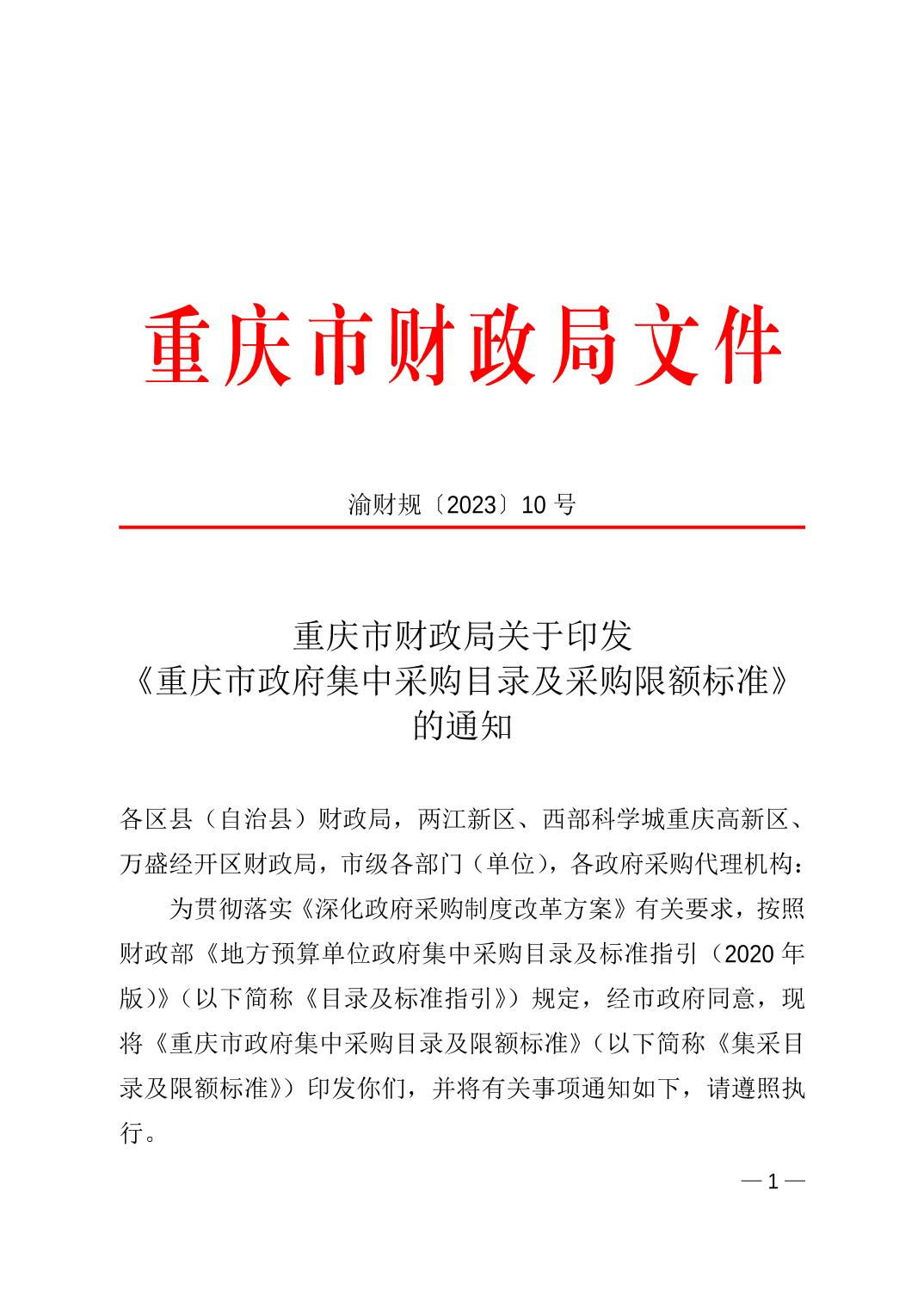 现将《重庆市财政局关于印发<重庆市政府集中采购目录及采购限额标准>的通知》(渝财规〔2023〕10号)转发给你们,请遵照执行。