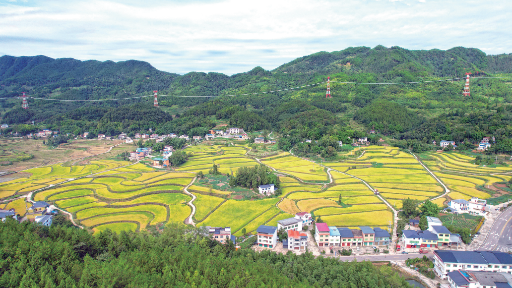 9月21日,铁门乡铁门社区,金黄的稻田、错落有致的民居与远处连绵的群山构成一幅和美乡村画卷。记者 向成国 摄