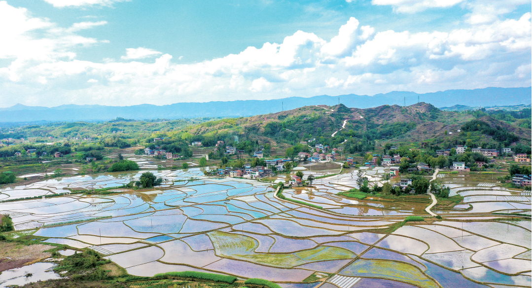 3月30日,双桂街道盐河村,一块块春水田宛若镜子般镶嵌于群山怀抱之中,倒映着蓝天白云、村庄农舍,构成一幅充满诗意的山水田园画卷。记者 熊 伟 摄