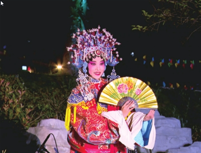 夜幕降临,微风习习,表演者们以自然为舞台,将歌舞和山清水秀的景色融合,吸引了不少游客前来观看。当晚,唯美而活泼的舞蹈《唐宫夜宴》和曲调百转千回的经典京剧《贵妃醉酒》,一出场便赢得观众阵阵掌声。表演者用秀逸韵致的舞蹈和优美的戏腔,将游客一秒带回大唐盛世,真是惊艳。