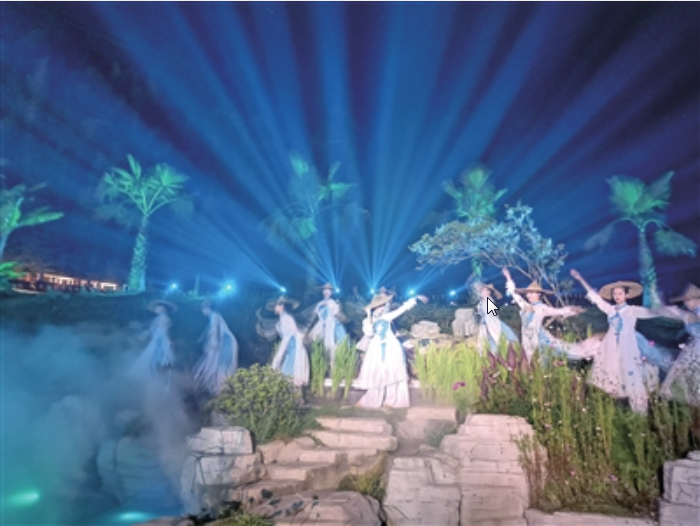 本次歌舞晚会汇集了形式各样的丰富表演,不仅有西方乐器演奏,传统及现代舞蹈,还有民歌和流行音乐。现场,京胡演奏《夜深沉》、二胡演奏《赛马》《睡莲》《浏阳河》、舞蹈《竹之词》、川剧版《青花瓷》等特色节目接连上演,或欢腾热烈,或悠扬动人,通过户外音乐会的形式,将自然与歌舞融于一体,让游客不必远行也能解锁“诗和远方”,沉浸式享受悠然与清凉。